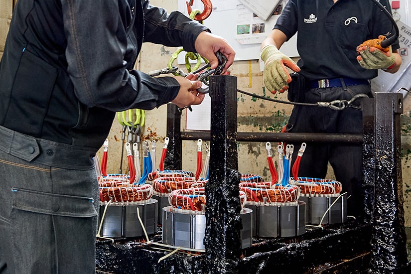 できあがったステーターを、ワニスに浸して乾燥機へ。これにより紐やコイルを固めて、ようやくお客様へ納品できる状態に。ワニス含浸は、法的な規制が厳しく新規参入しづらい技術。まさに山市電機の信頼と実績を物語る工程です。